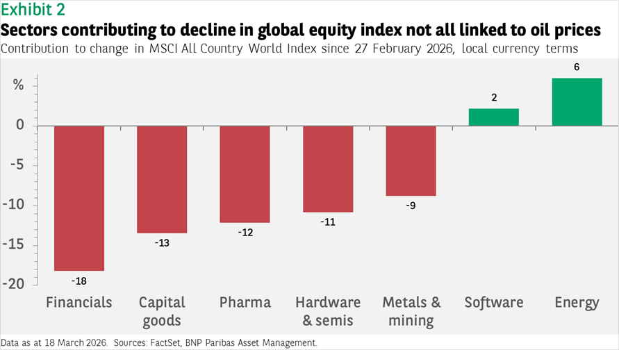 For example, the industry contributing the most to the 4.2% decline in the MSCI All Country World Index (in local currency terms since 27 February 2026) has been financials, driven at least partly by ongoing worries about private credit. The fall in capital goods reflects higher oil prices and worries about global growth, but not the drop in technology hardware and semiconductor stocks, which had gained significantly in February.