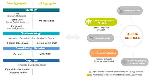 This is, we believe, one of the strengths of euro fixed income; contrary to other regions, euro fixed income has more than one sovereign curve which provides opportunity to position where it is the most appropriate. As illustrated below, euro-denominated bond markets, in comparison with the US, offer unique diversification within a global fixed-income sleeve due to a broad selection of alpha sources.