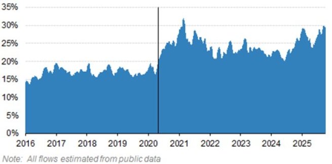 After six months without a daily correction of more than 2% for the S&P 500, equities endured a bout of volatility on 10 October when Trump took to social media to berate a hostile trade attitude from China relating to its actions on rare earths and export controls. In a classic Trump gesture, he first threatened a massive increase in tariffs on Chinese products, only to finally appease markets later by confirming he will be meeting President Xi Jinping in South Korea - the first time since Trump returned to the White House. As tariff uncertainty made a comeback, the positioning reduction from volatility-controlled strategies and discretionary investors was well absorbed by the market judging by the limited losses on the S&P 500. This is especially important considering the return to a higher volatility regime also triggered some profit taking in high-momentum trades which have been retail favourites since the market rally began in late April.
