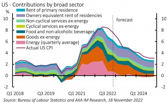 The question facing the US is whether or not the economy will tip into recession. Our view since the summer has been that it will, and we now expect a recession starting in early 2023. Pinpointing dates is difficult, as recessions typically reflect the concerted reactions of consumer spending, hiring, investment and inventory – often influenced by external events. Recession in Europe, prompted by the energy shock as a result of the Ukraine crisis, will be a headwind to domestic activity – though we believe domestic dynamics will drive the US contraction.