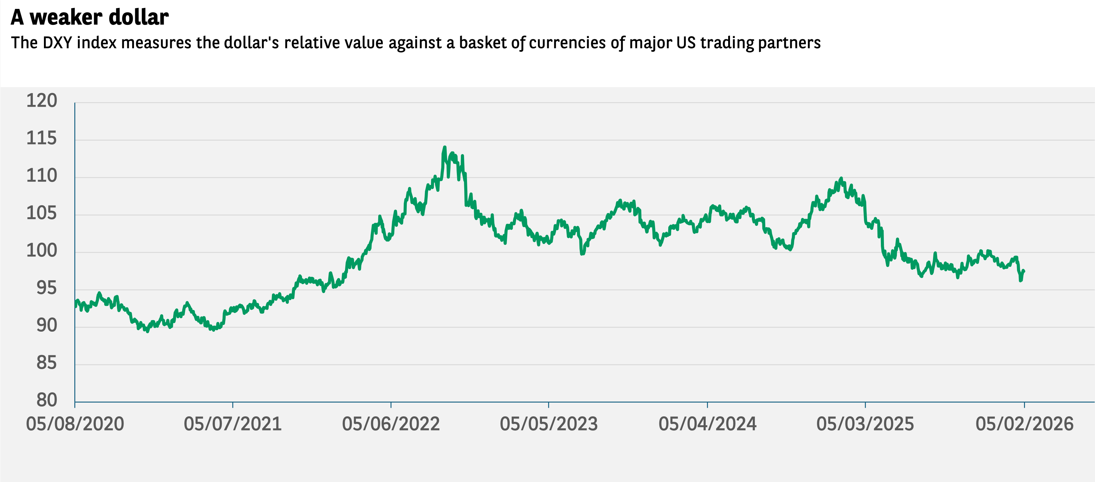美元指數(DXY)衡量美元相對於多個美國貿易夥伴貨幣的價值。當美元相對於其他貨幣貶值(即價值下降)時,美元指數會下跌。截至 1 月份的過去 12 個月,美元指數已下跌超過 10%。投資者部分因對美國政府經濟政策的擔憂,同時也為了把握美國以外的投資機會並進一步分散平衡型投資組合的風險,因此開始將資金從美元轉向其他資產。