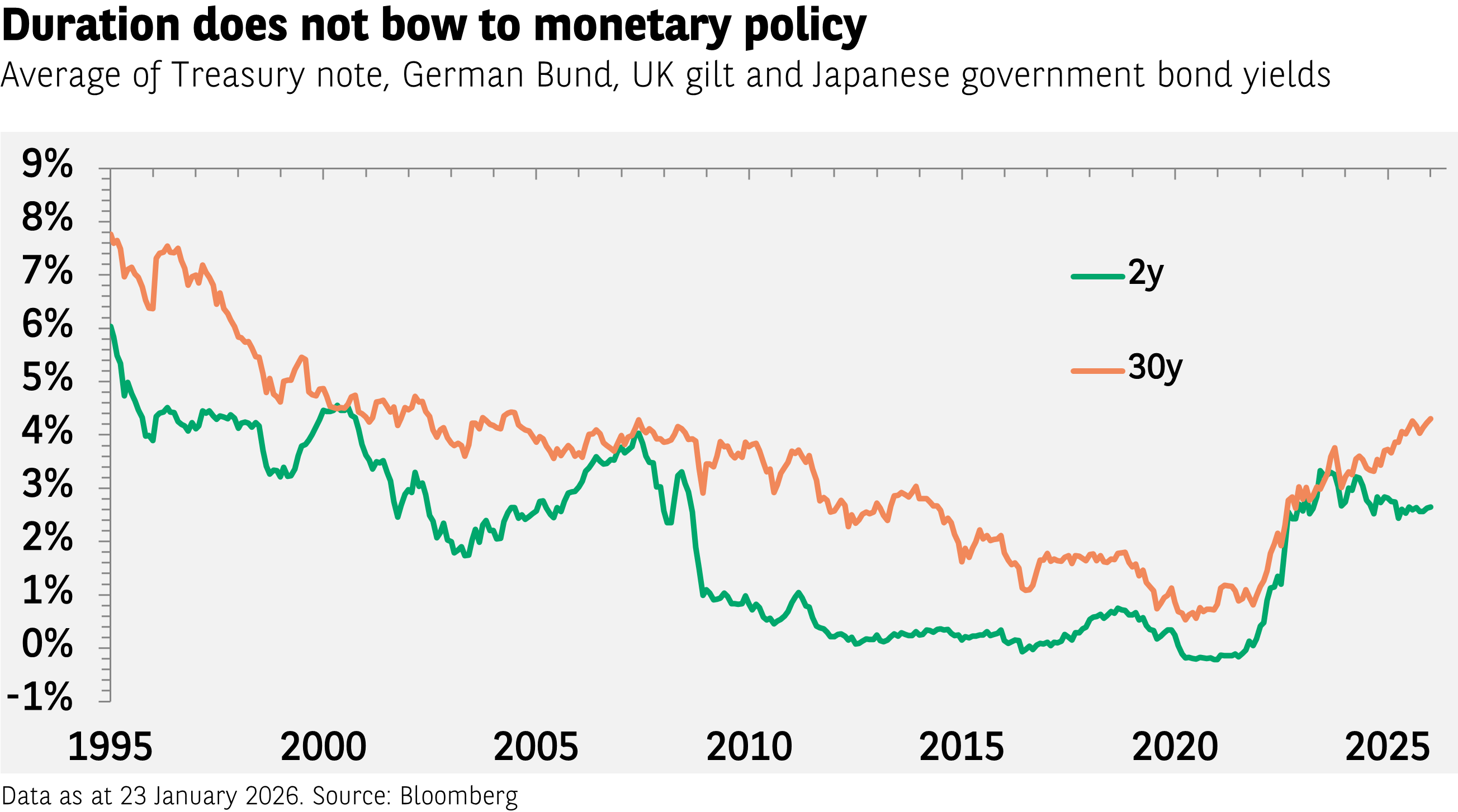 根據普遍的共識,投資者似乎對未來市況持相當樂觀的看法,而這種樂觀預期已反映在他們的投資組合配置上。儘管自2026年初以來地緣政治不確定性再次升溫,但投資者似乎堅信全球經濟面對不可預測的衝擊仍能保持韌性,並相信貨幣政策會採取必要措施來緩衝金融狀況短期惡化的影響。然而,儘管過去12個月各國央行已經降息,長期債券的殖利率卻有所上升,尤其是在日本,這凸顯出投資者對長期政府債務的擔憂。